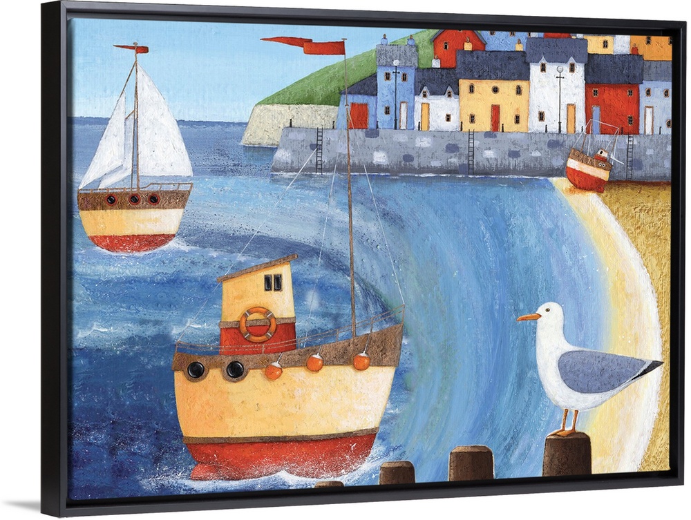 <p>Contemporary nautical themed painting of a small harbor town with boats anchored on the shore line.</p>
