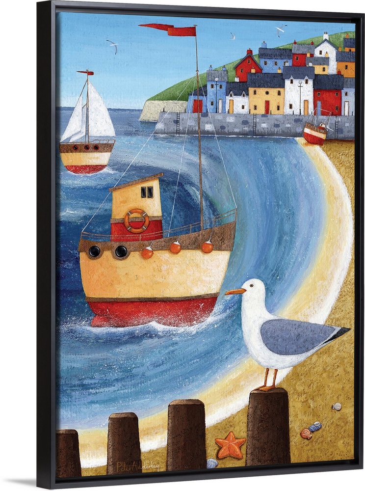 <p>Nautical themed painting of a harbor town with boats off shore.</p>