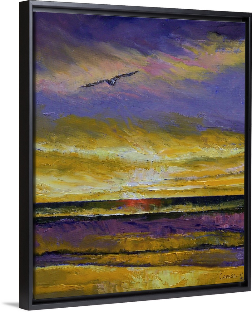 <p>Big, vertical wall painting of a seagull flying over water at sunset. Painted with thick ,heavy brushstrokes.</p>