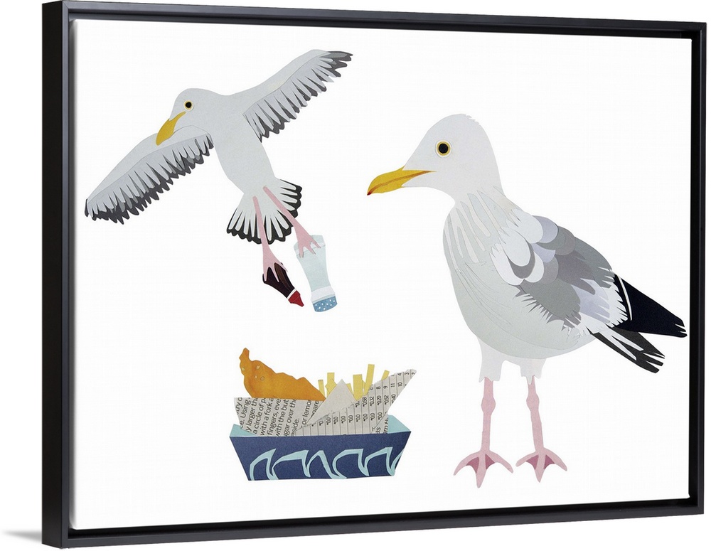 <p>Contemporary paper cut illustration of a gull against a white background, with a flying gull stealing food from a basket.</p>