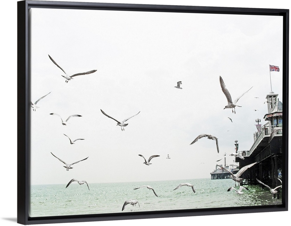 <p>Seagulls flying around Brighton pier with Union Jack mast.</p>