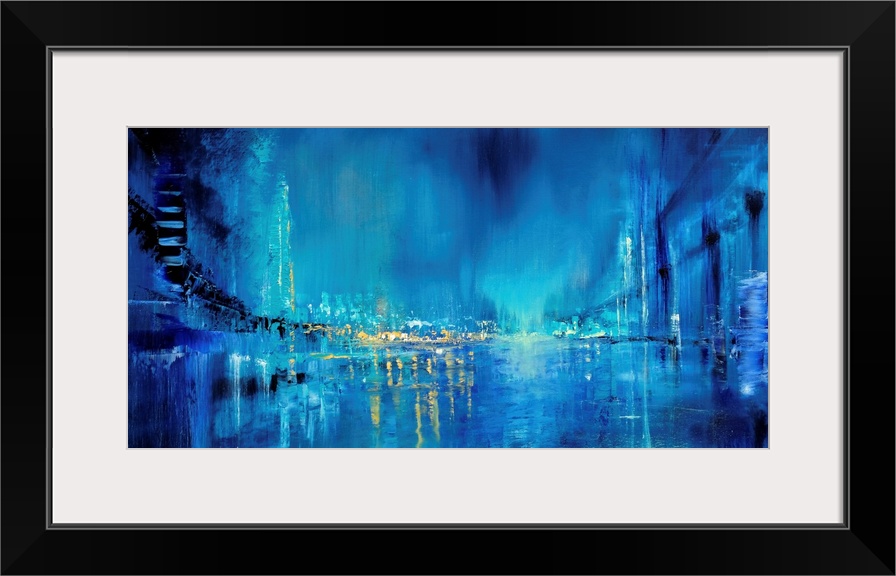 <p>Abstractly painted cityscape in bright colors and structures: on the way on a suspension bridge, in the background a large, lively city with the silhouette of skyscrapers in blue. Reflection of the lights in the water.</p>