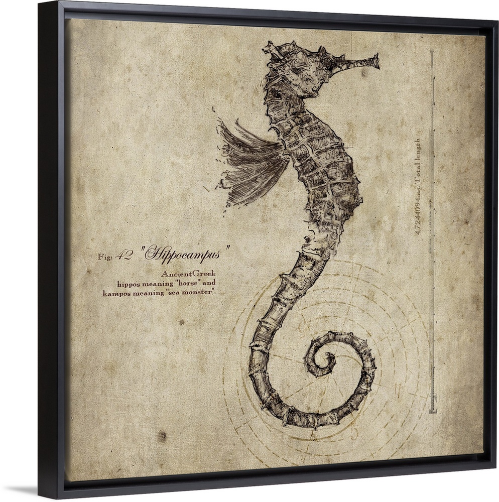 <p>Contemporary artwork of a vintage looking scientific drawing of a seahorse profile.</p>