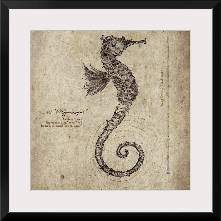<p>Contemporary artwork of a vintage looking scientific drawing of a seahorse profile.</p>