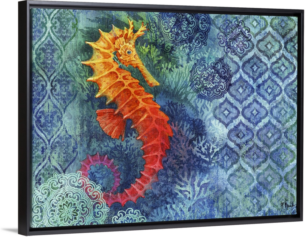 <p>Painting of a seahorse on a batik background decorated with corals</p>
