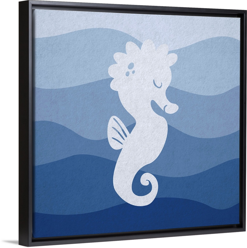 <p>Nursery art of a seahorse swimming in blue waves.</p>