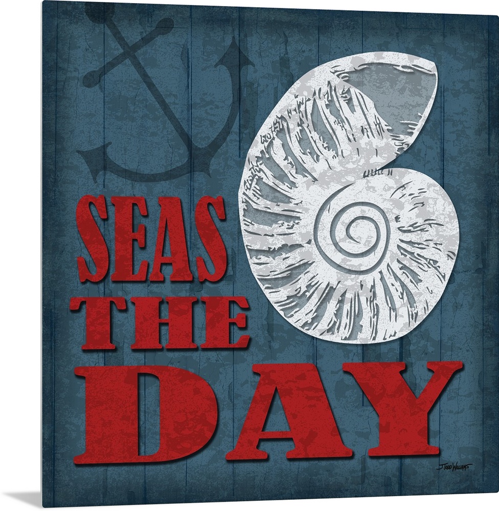 <p>"Seas the day" square beach decor in blue, red, and white.</p>