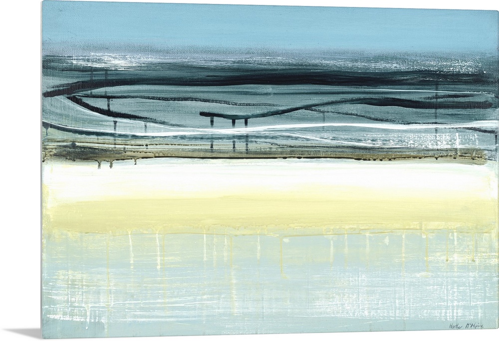 <p>A modern abstract landscape of a beach scene in bold brush strokes of gray, yellow and blue.</p>
