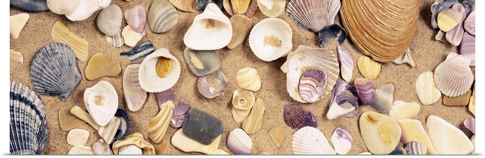 <p>Panoramic picture of shells clustered together and pressed in to the sand.</p>