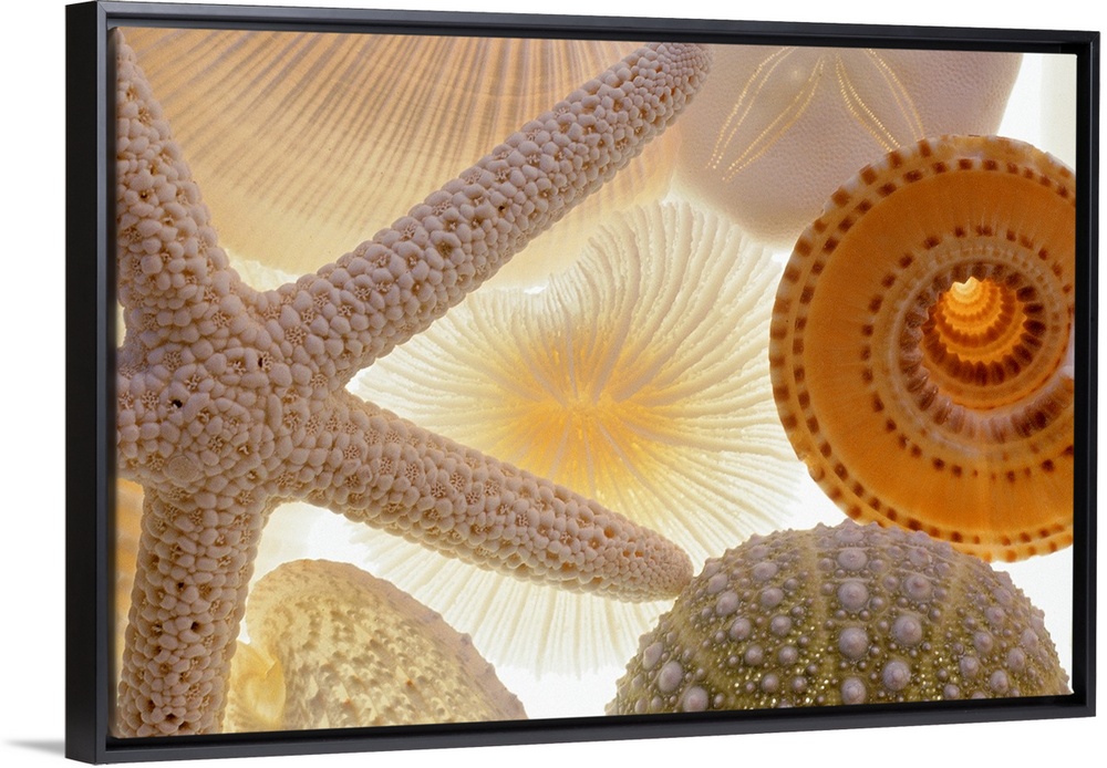 <p>Large, horizontal photograph of a variety of backlit seashells and a starfish.</p>