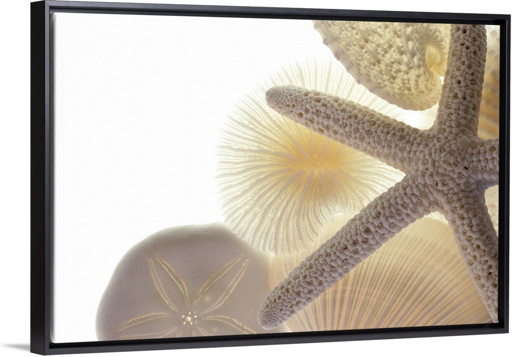 <p>This closely taken photograph contains seashells, a starfish and a sand dollar all in an off white color.</p>