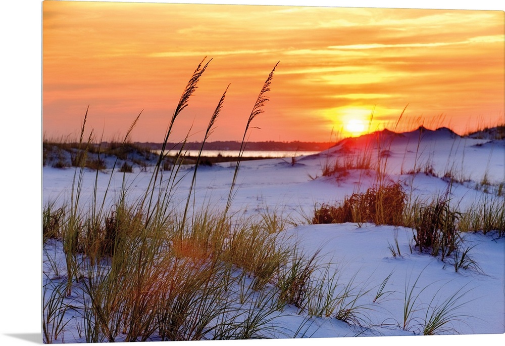 <p>Photograph of a orange and yellow sunset over sandy dunes on a beach.</p>