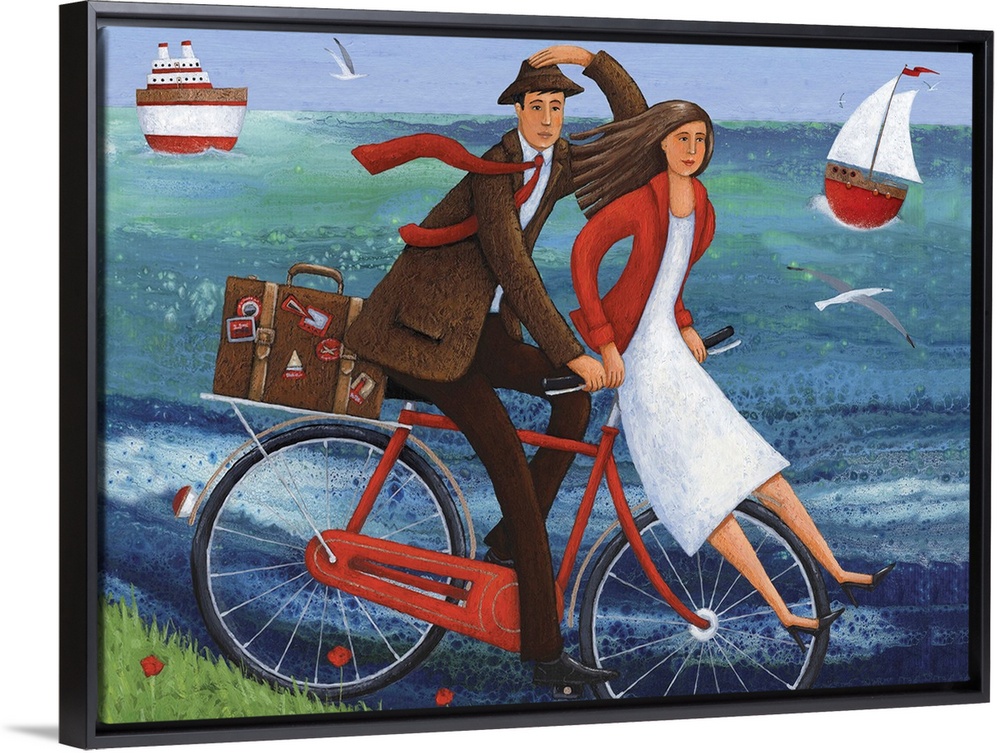 <p>Contemporary painting of a woman sitting on the handle bars of a red bike while a man pedals it.</p>