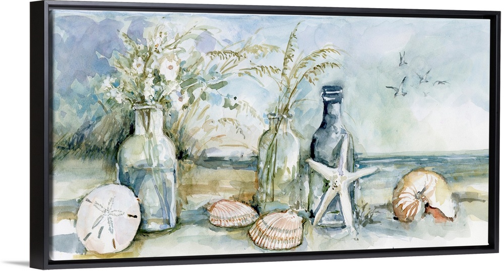 <p>A seaside still life of bottles, shells, starfish, and sand dollar.</p>