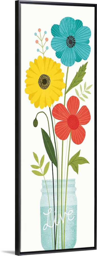 <p>Tall, rectangular art of wildflowers in a mason jar with the word "Live" etched on it.</p>