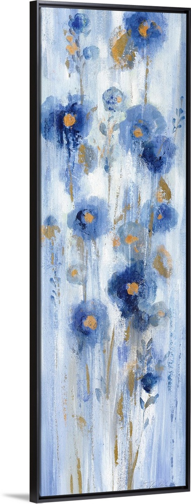 <p>Long vertical abstract painting of blue flowers with accents of gold.</p>