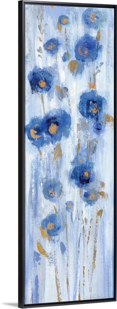 <p>Long vertical abstract painting of blue flowers with accents of gold.</p>