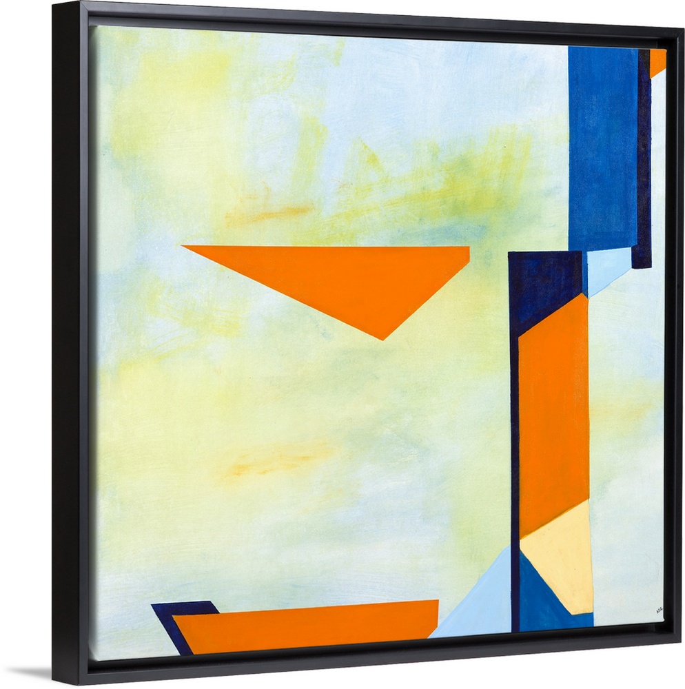 <p>Square abstract artwork with a light blue and green background and vibrant blue and orange shapes on top.</p>