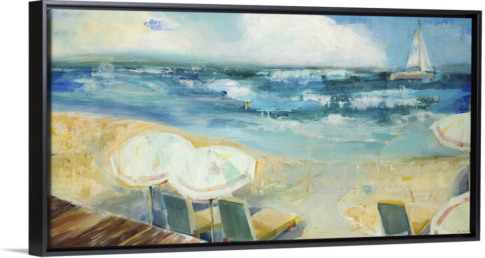 <p>Contemporary painting of a beach scene with a view of the sea.</p>