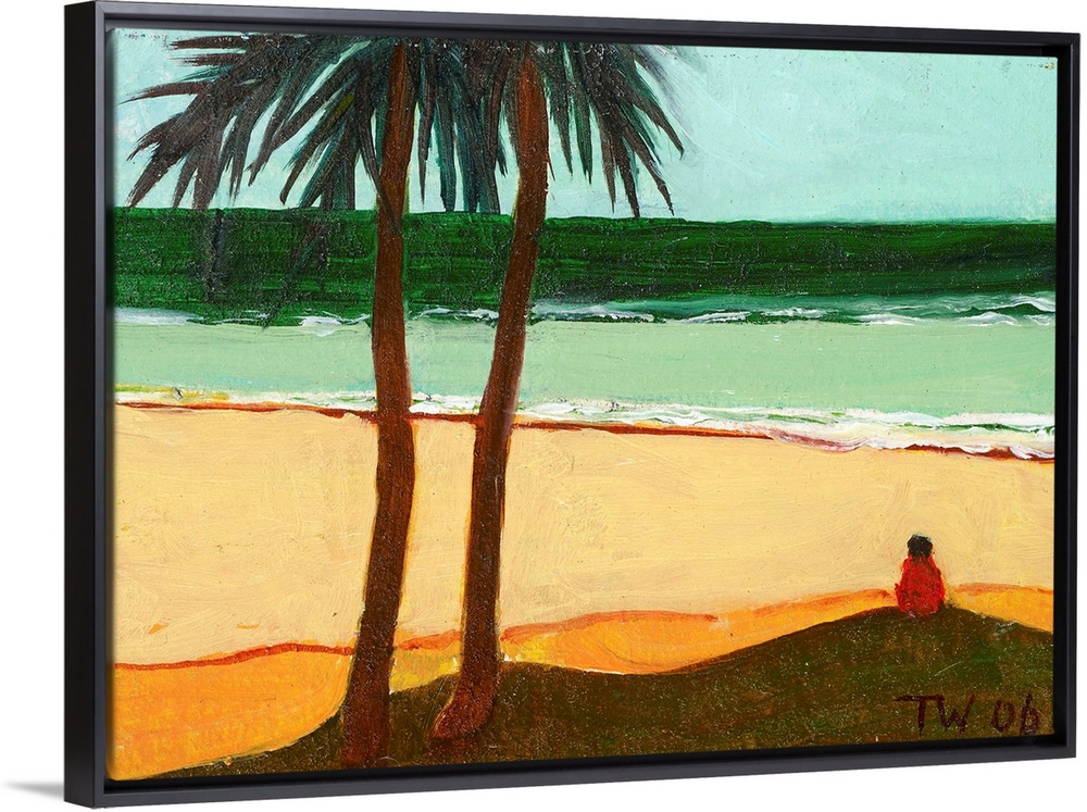 <p>Contemporary painting of a figure on a beach by the coast next to two palm trees.</p>