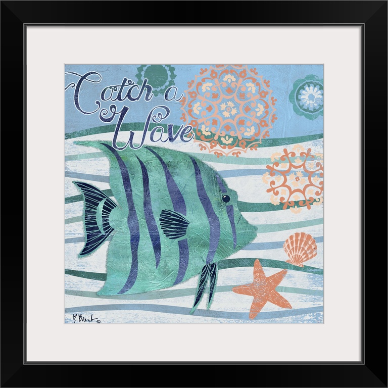 <p>Contemporary decorative artwork of a tropical fish on a stylized wave background with sea life elements.</p>