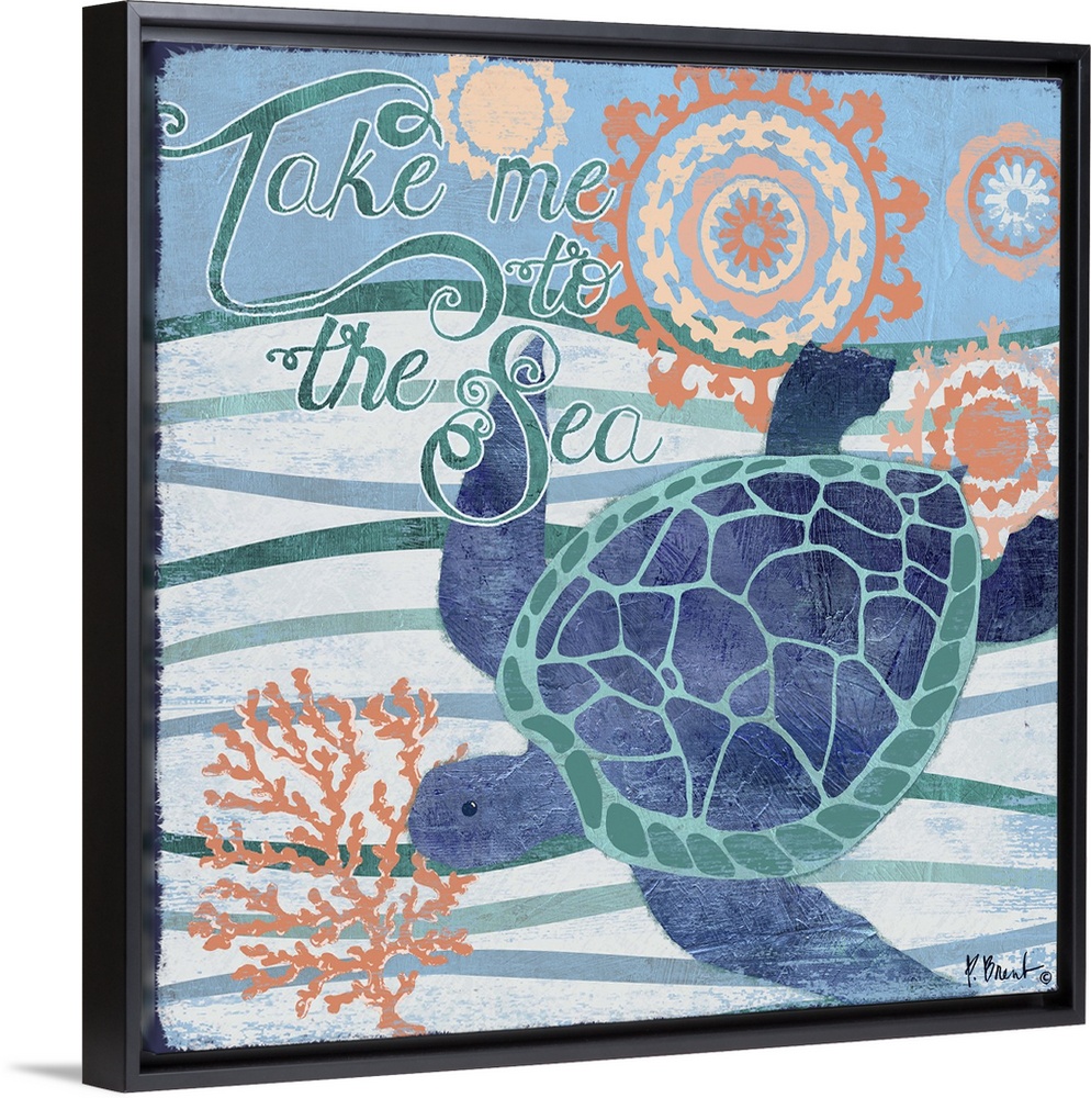 <p>Contemporary decorative artwork of a sea turtle on a stylized wave background with sea life elements.</p>