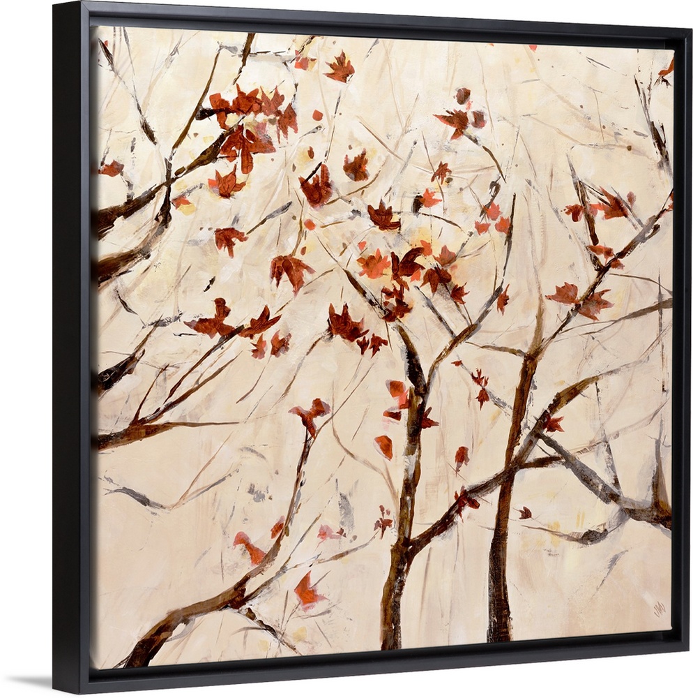 <p>Contemporary painting of several thin branched trees with scattered fall leaves.</p>