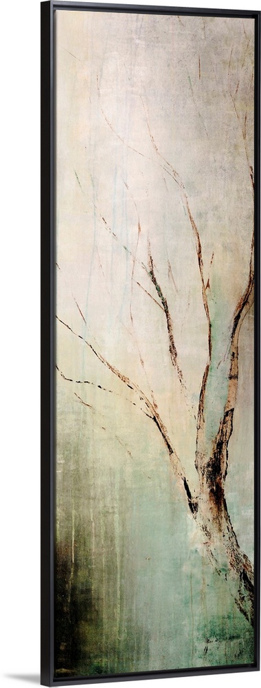 <p>Panoramic contemporary art depicts a lone tree branch composed of earth tones as it sits in front of a bare background.</p>