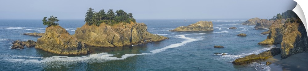 <p>Seastacks and flagged trees seen from Thunder Cove on the Pacific Coast, Brookings, Curry County, Oregon, USA.</p>