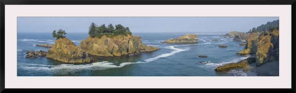 <p>Seastacks and flagged trees seen from Thunder Cove on the Pacific Coast, Brookings, Curry County, Oregon, USA.</p>
