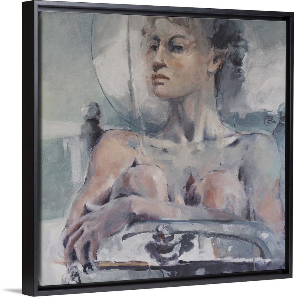 <p>This contemporary artwork features a female model gazing into the distance shaped from soft blues offset by peach colors.</p>