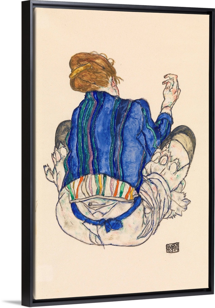 <p>The psychological intensity of Schiele's self-portraits is rarely encountered in his numerous studies of young women - many nude or provocatively dressed - who are treated in a detached manner as objects for formal analysis. Often isolated on a page, without any reference to their surroundings, these figures are exquisite studies in line, composition, and gesture. This portrait of a seated woman viewed from behind is expressive even though her face is hidden. The model was likely Schiele's wife, Edith Harms, then twenty-four, whom he married in 1915 and who died of influenza only three days before he did. Only partially dressed but with her strawberry-blond hair carefully coiffed, the figure wears a bright blue striped jacket over a white striped shirt - the attire of a respectable lady. Her lower body, however, is clad in the garments in which Schiele usually depicted prostitutes - a white lace slip and dark stockings. The marked difference between the two parts of her costume seems to reflect the artist's own ambivalent feelings about his wife, who is variously shown in his art as a cold virgin or a passionate lover.</p>