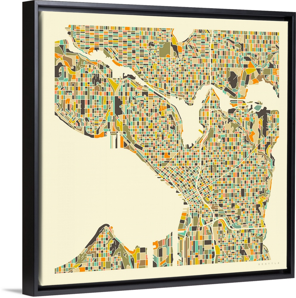 <p>Colorfully illustrated aerial street map of Seattle, Washington on a square background.</p>