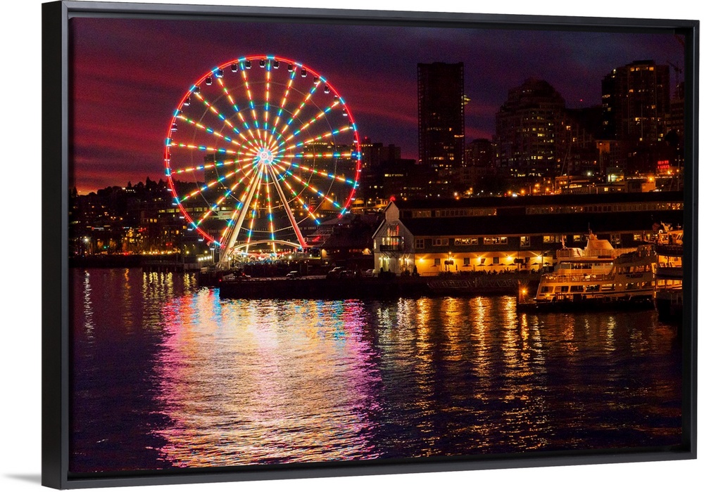 <p>United States, Washington, Seattle. The Seattle Great Wheel on the waterfront in downtown Seattle in the evening.</p>