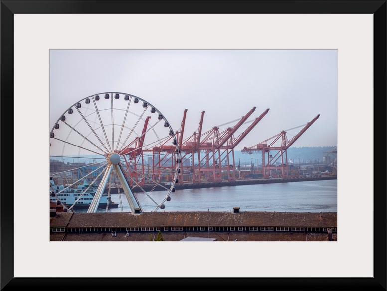 <p>View of Seattle's giant Ferris wheel with dockside cranes in the background in Seattle, Washington.</p>