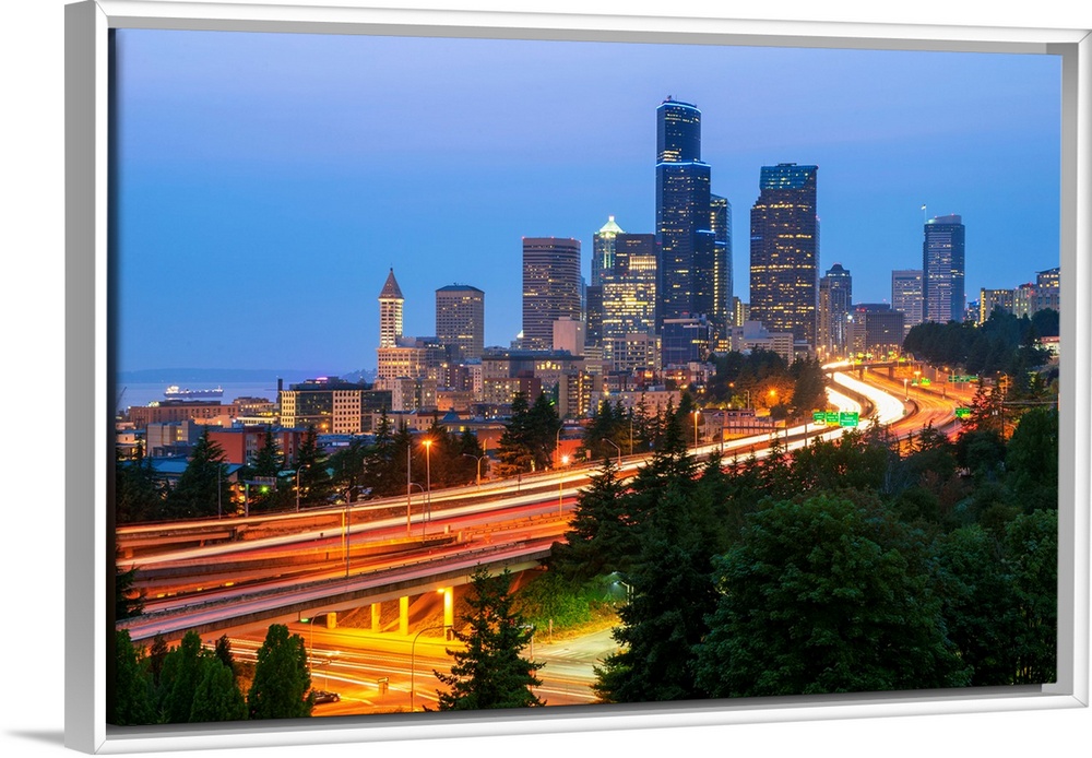 <p>Photograph of the Seattle skyline at dusk with light trails from the cars on the highway in the foreground.</p>