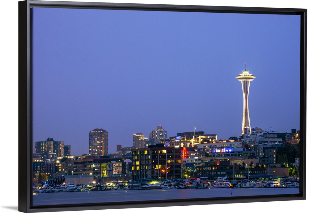 <p>Photograph of the Seattle skyline lit up at night from the water.</p>