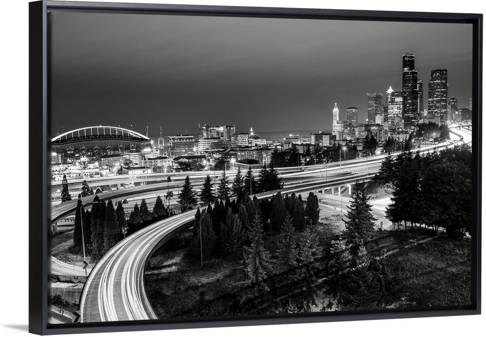 <p>Panoramic photograph of the Seattle skyline at night with light trails from the car lights on the highway.</p>