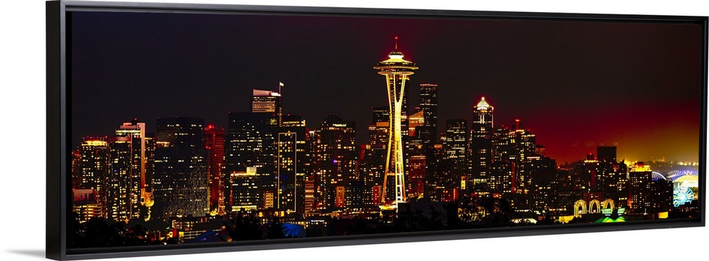 <p>Seattle Night Panorama with the Space Needle in The Caenter and Waterfron Ferris Wheel in the Right, Washington State, USA</p>