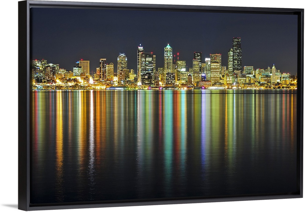 <p>Large photograph taken of the Seattle skyline at night with the buildings lit up and reflecting in the water below.</p>