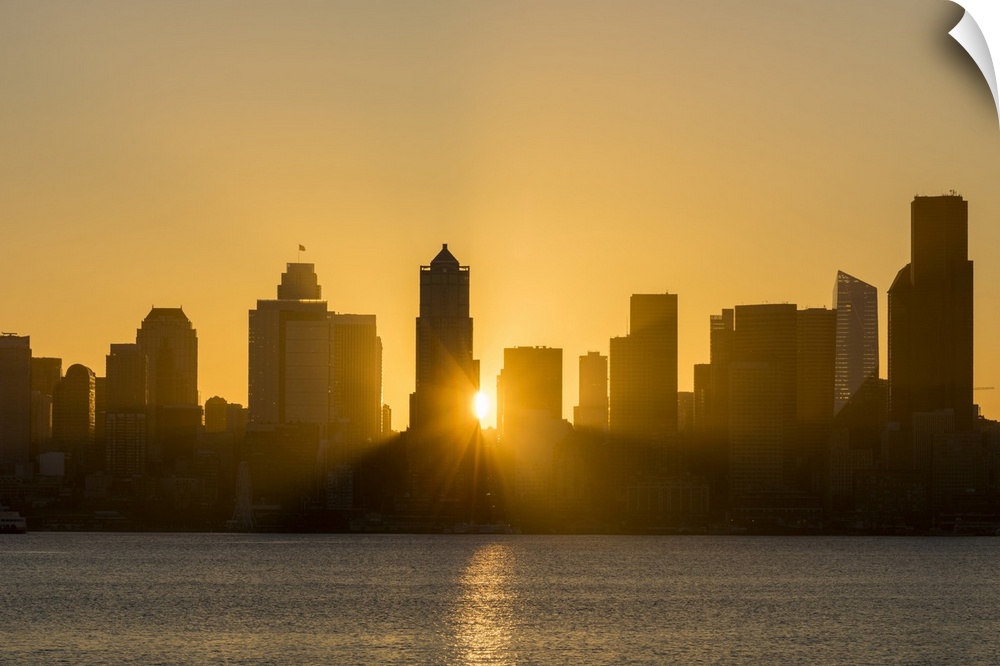 <p>Seattle skyline at sunrise, as seen from Alki Beach, Seattle, Washington State, United States of America, North America</p>