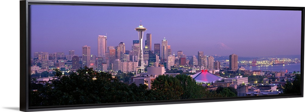 <p>Panoramic view of the Seattle, Washington skyline in the early evening, with the Space needle clearly visible in the center, and Mount Rainier in the distance.</p>
