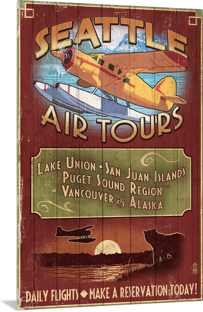 <p>Retro stylized art poster of a vintage sign painted to look like wood planks, advertising a seaplane in flight.</p>