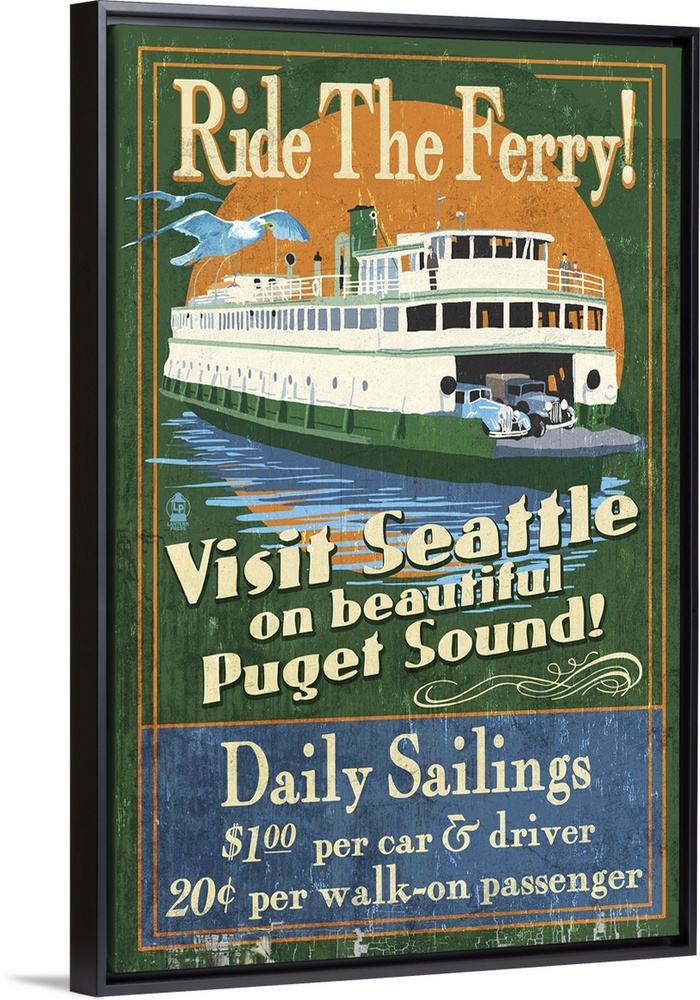 <p>Retro stylized art poster of a vintage sign with a ferry on the water.</p>