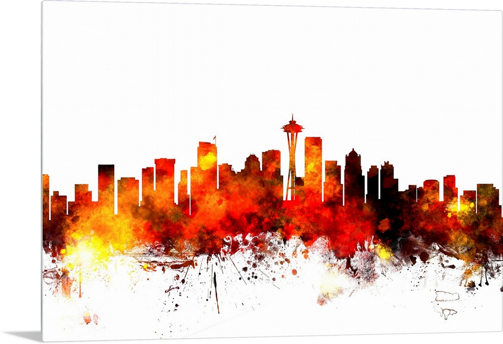 <p>Contemporary piece of artwork of the Seattle skyline made of colorful paint splashes.</p>