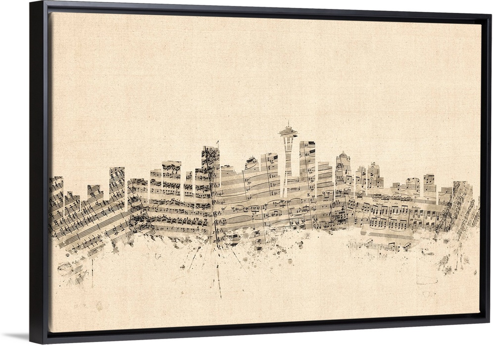 <p>Seattle skyline made of sheet music against a weathered beige background.</p>