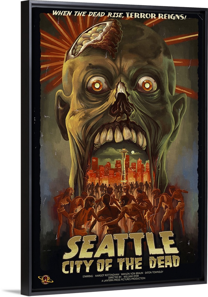 <p>Retro stylized art poster of a zombie head opening its mouth, to reveal a city being being mobbed by zombies.</p>