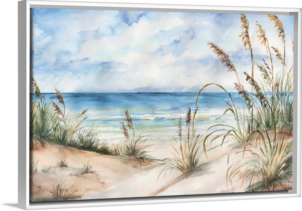 <p>A contemporary watercolor painting of grass cover sand dunes on a beach with a blue sky above.</p>