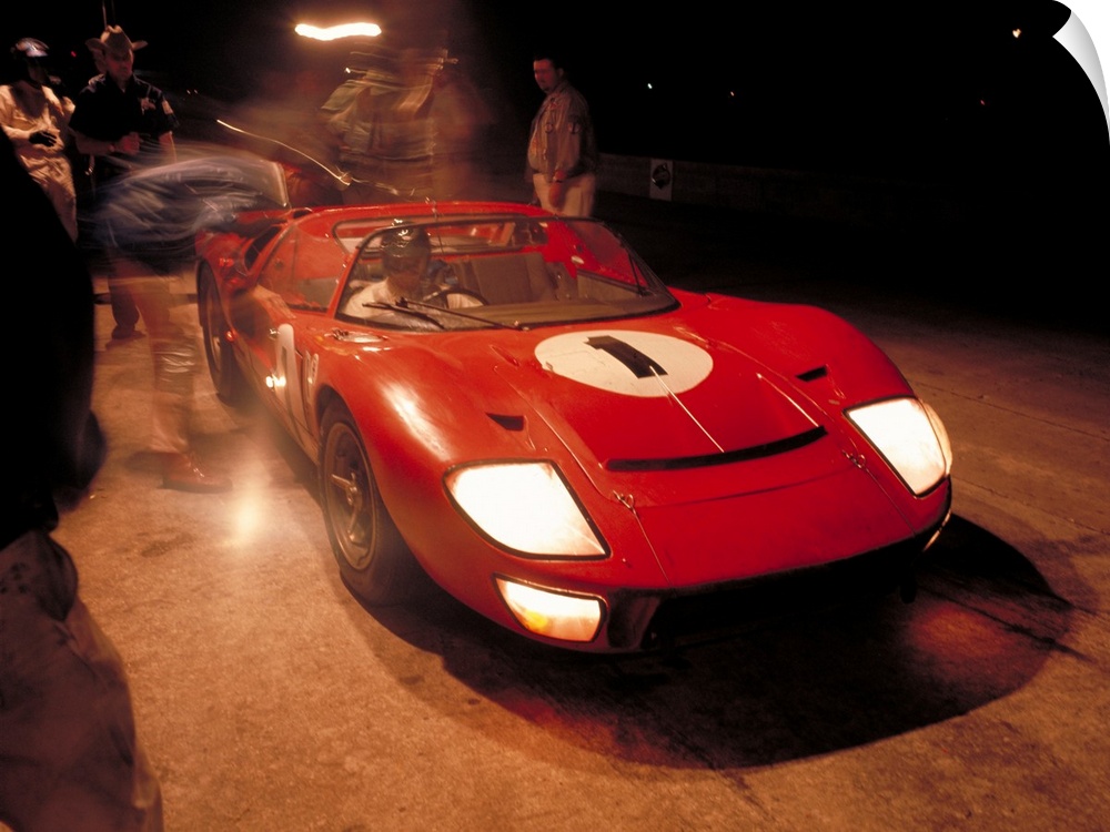 <p>Ken Miles and Lloyd Ruby in the Ford GT40 Mark II roadster making a scheduled night pit stop on its way to winning the 1966 Sebring 12 Hour Race.</p>