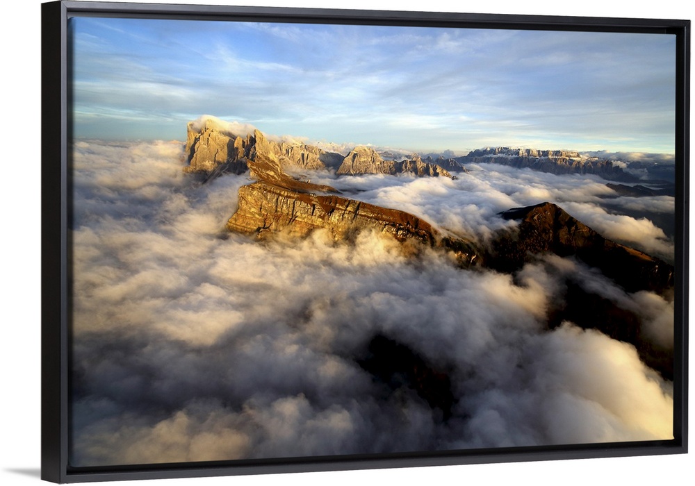 <p>Aerial shot from Seceda of Odle surrounded by clouds at sunset in the Dolomites, Val Funes, Trentino-Alto Adige South Tyrol, Italy, Europe</p>
